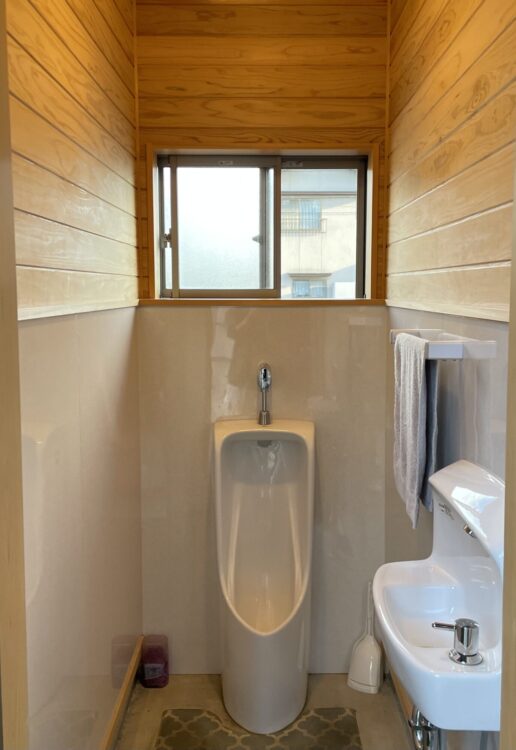 大便器と小便器に分かれていて、壁に杉やひのきの板を貼っています。