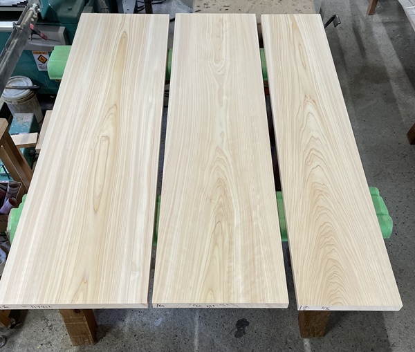 写真の幅の異なるひのきの板は3段の祭壇の天板になります。
