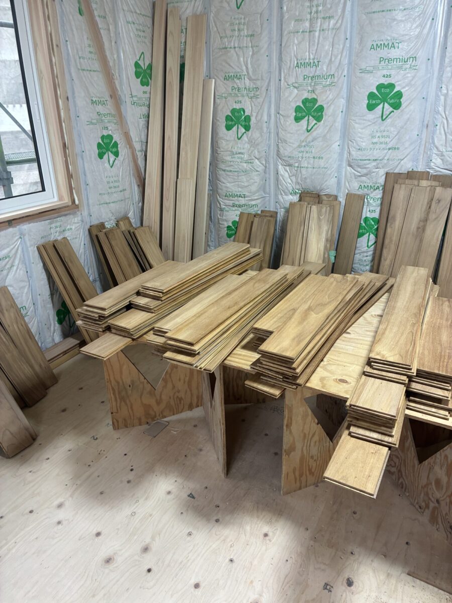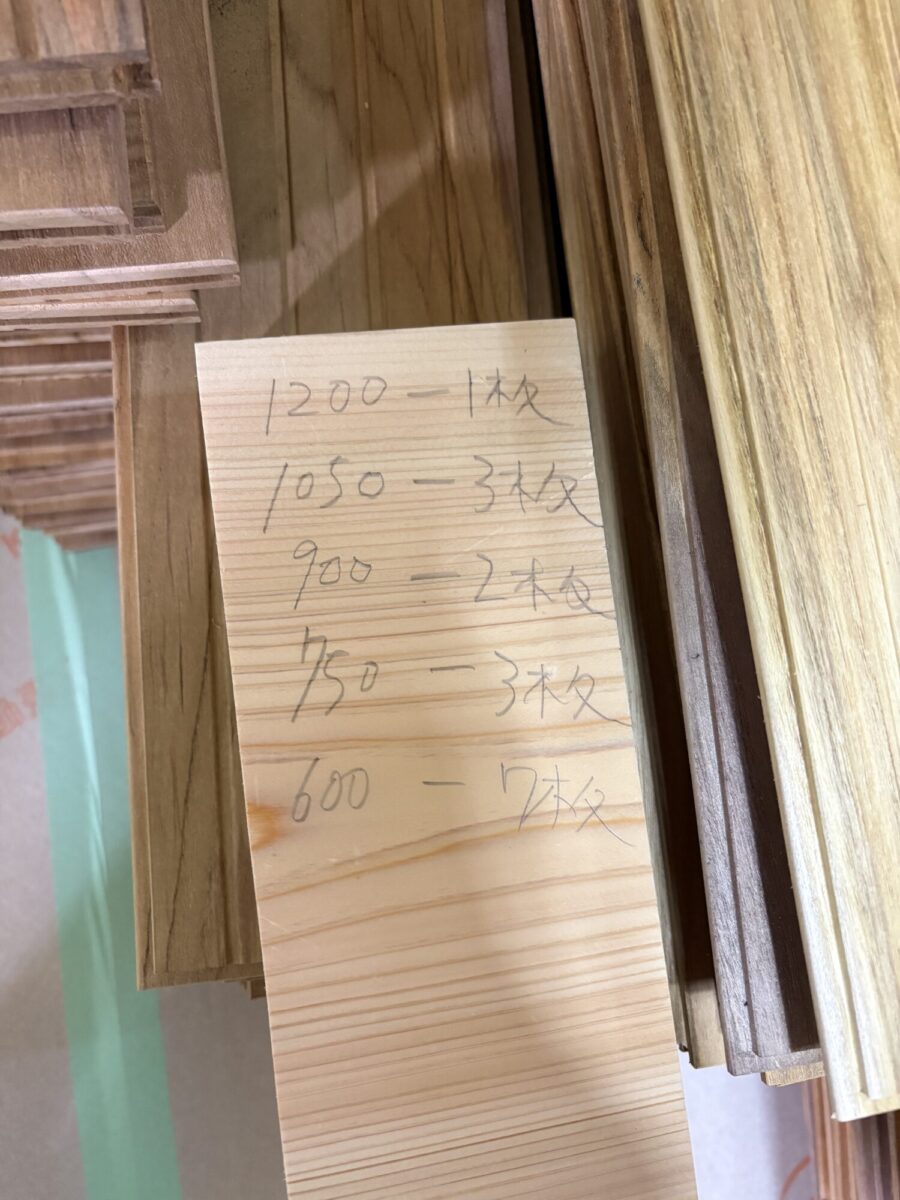 このように長さごとに並べて何が何枚あるか確認して大工さんが作業していました。
