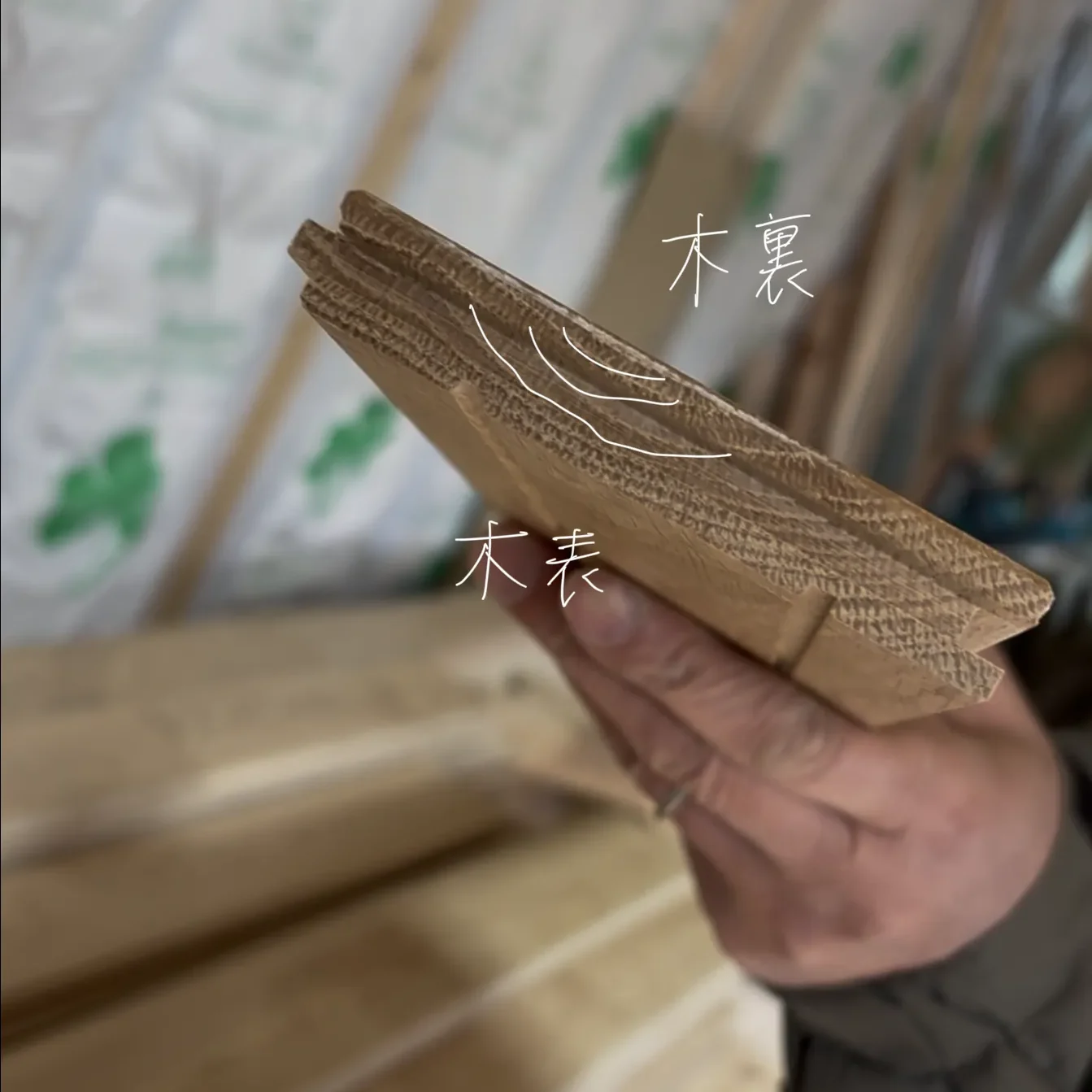 • 木表(きれいな面):リビングなど、家族が長く過ごし、素足で歩く場所に。