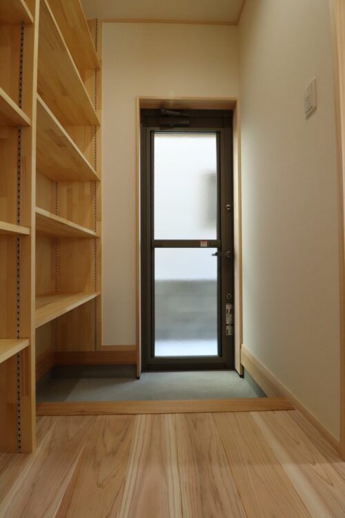 勝手口に、大型のオープン棚を設置して、買い物の仮置き場にも。