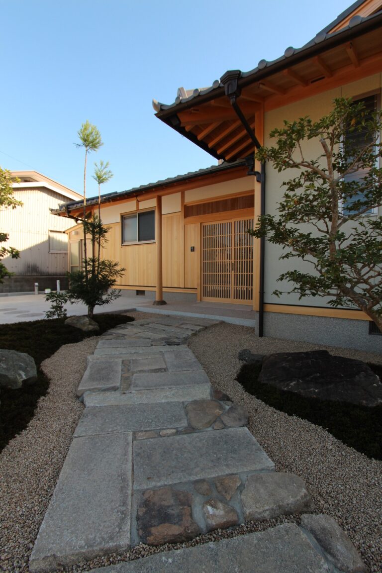元々お庭に使用されていた板石・建物の基礎石・長石等を、アプローチに再生しました。
