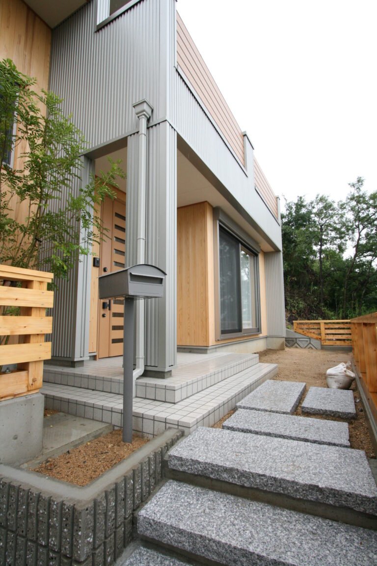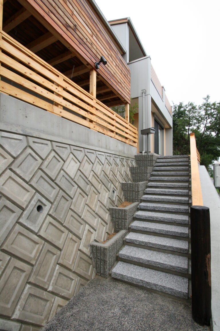 アプローチ階段は、天然御影石のたたき仕上げ。ウッドフェンスと、その延長階段手摺付きです。