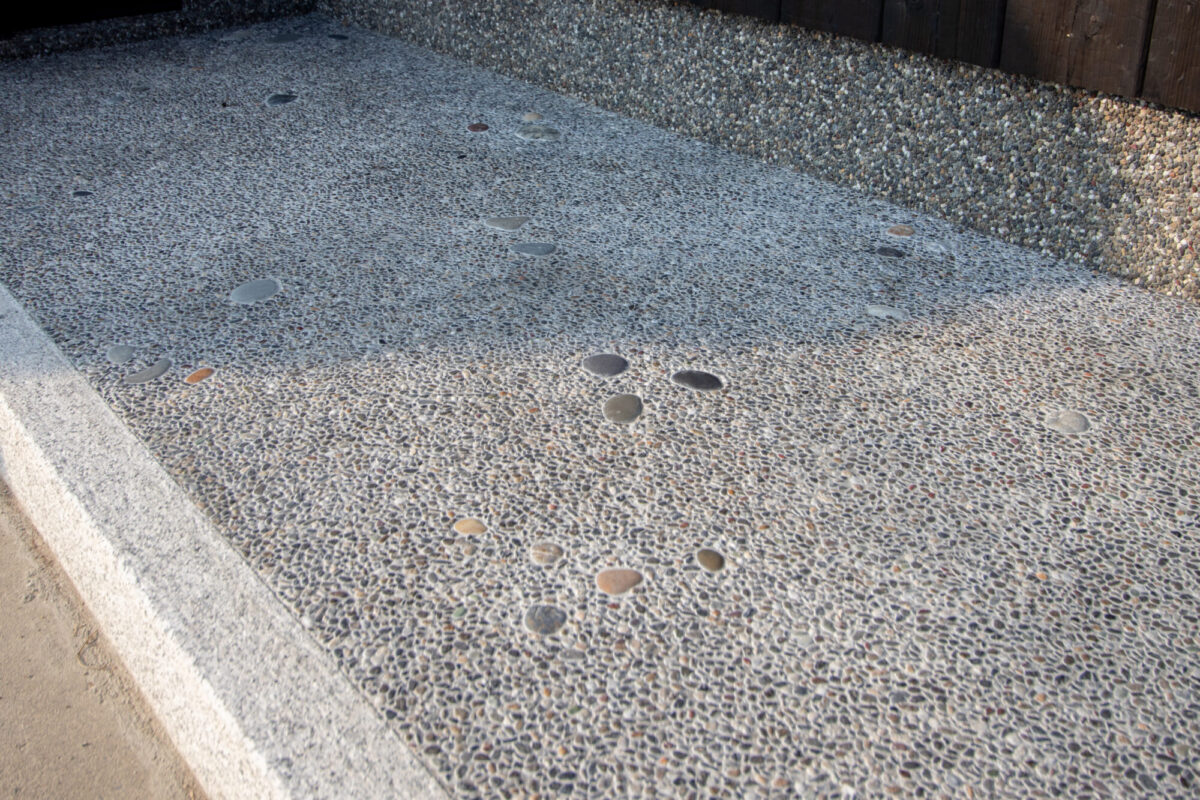 家族旅行の際に手に入れた玉石を、ポーチの土間洗い出し仕上げに、思い出として埋め込みました。