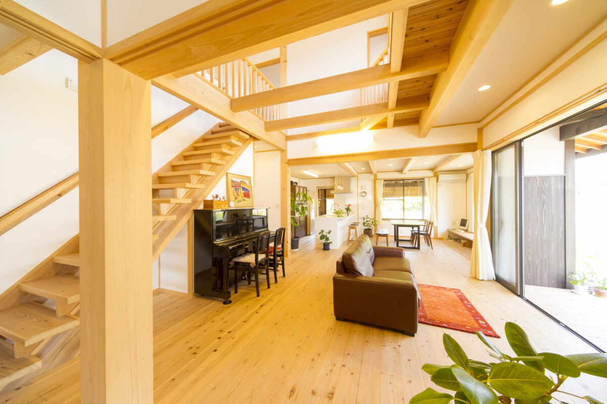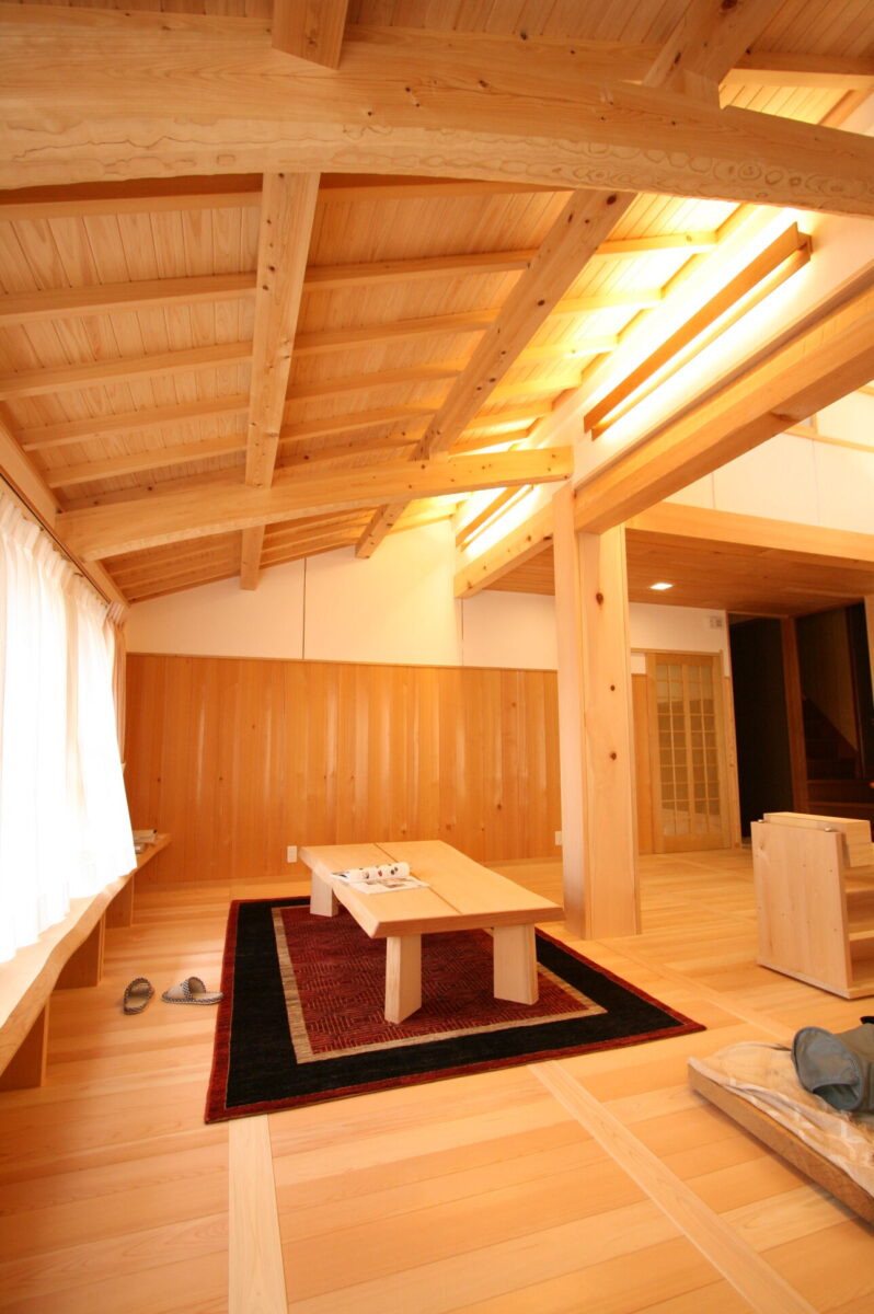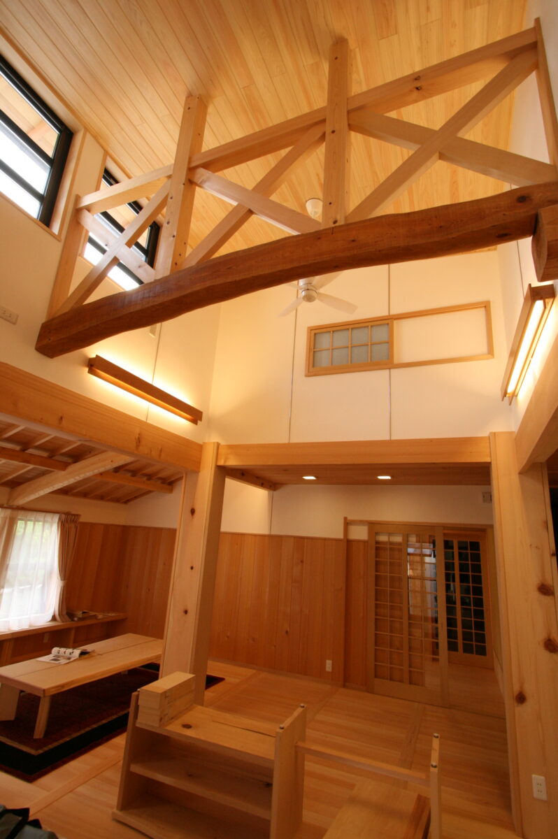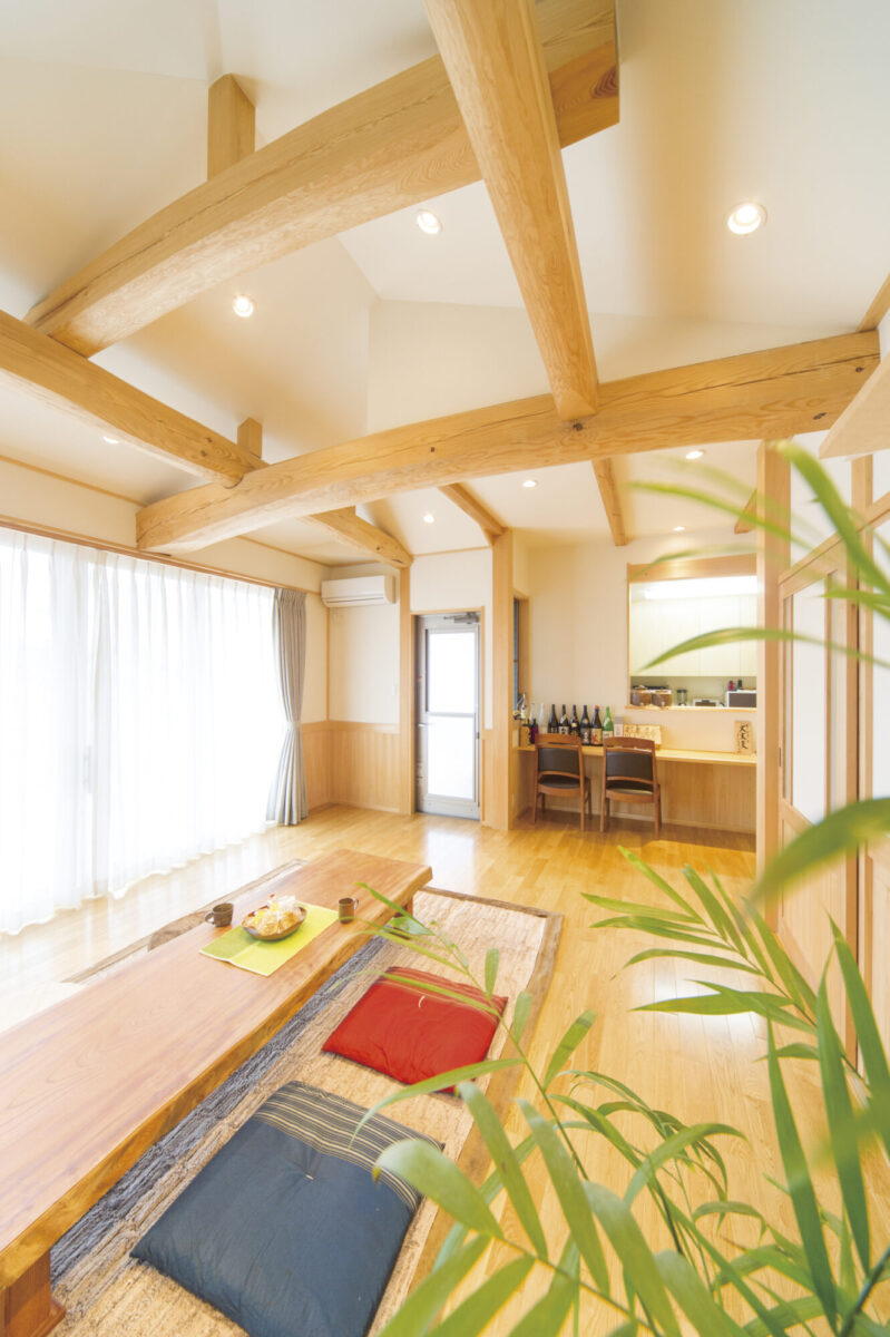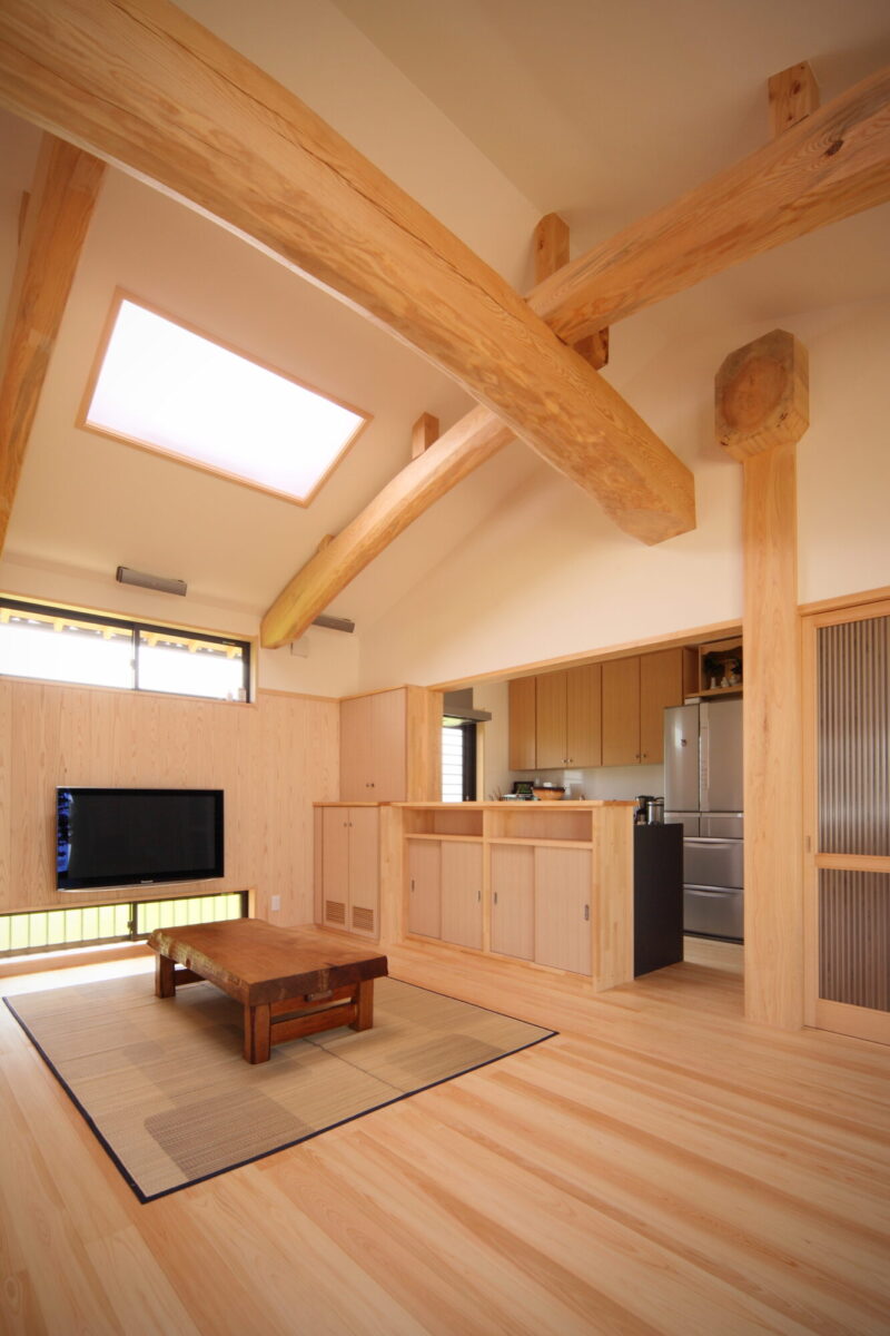 二階の床梁を化粧にして表し、太い大黒柱(桧角材・杉みがき丸太)を建て、広く開放的な空間を確保。