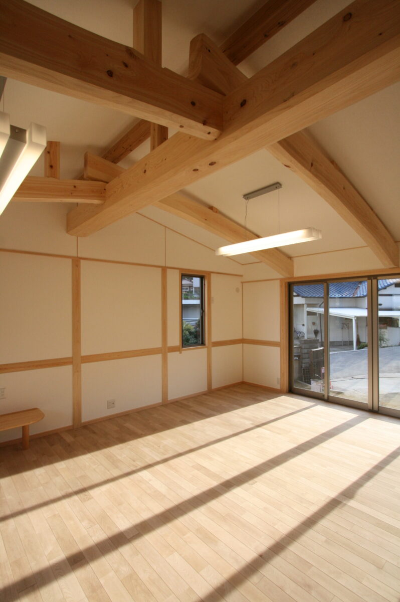 改築部は、既存の小屋梁を表し構造補強兼用のデザインで吹き抜け空間を確保し、さらに増築部は屋根構造を全て表す事により天井高を確保。