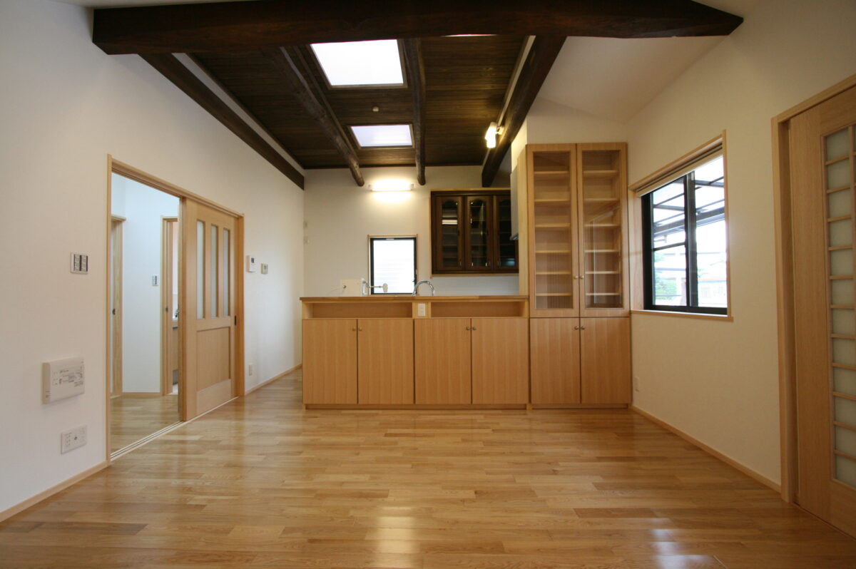 古民家の改築工事で、低かった天井を、既存の小屋梁を表しにして、クリーニング後、着色仕上げ。