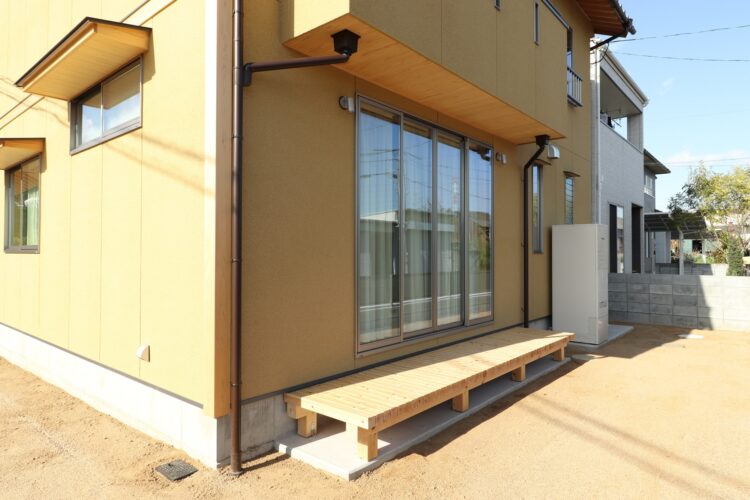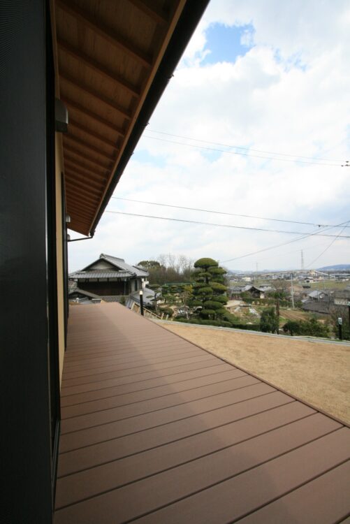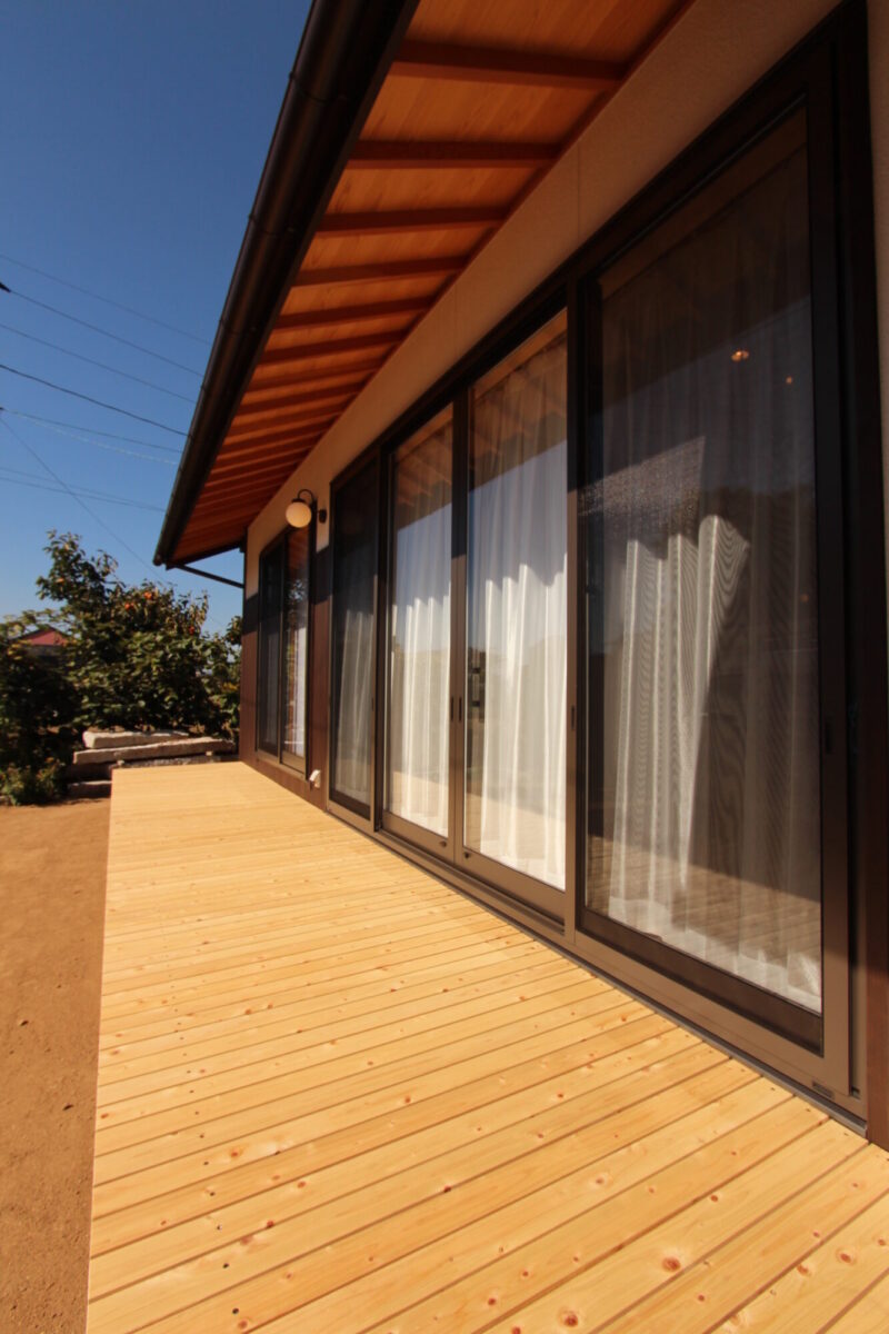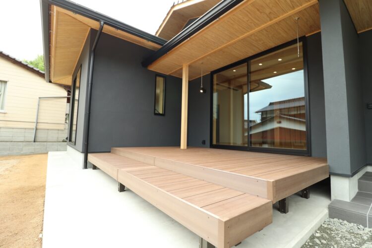 遠目に見ると天然木材にも見える擬木(木材を混入させた樹脂製)と、アルミ材を組み合わせた広いデッキ。
