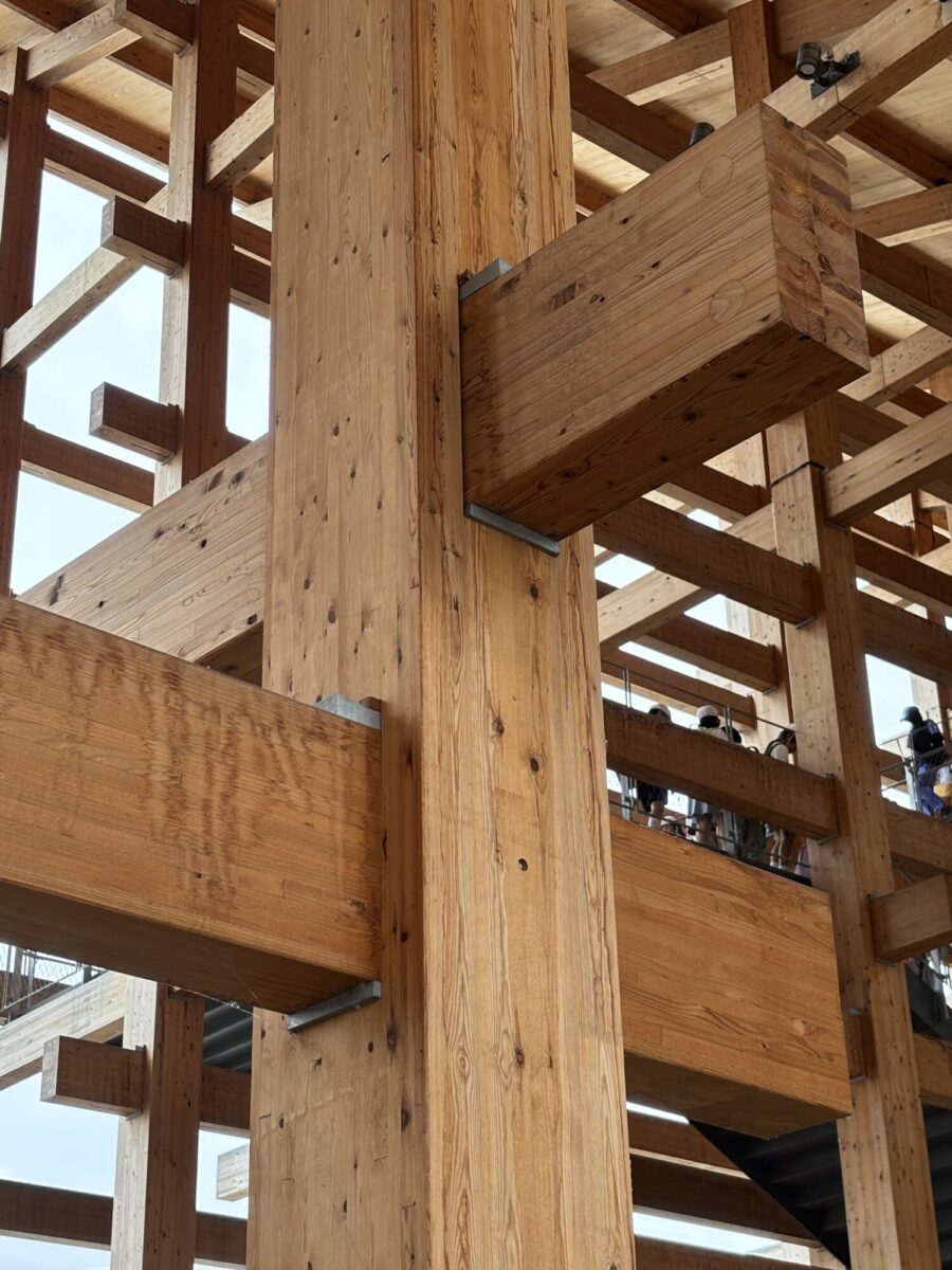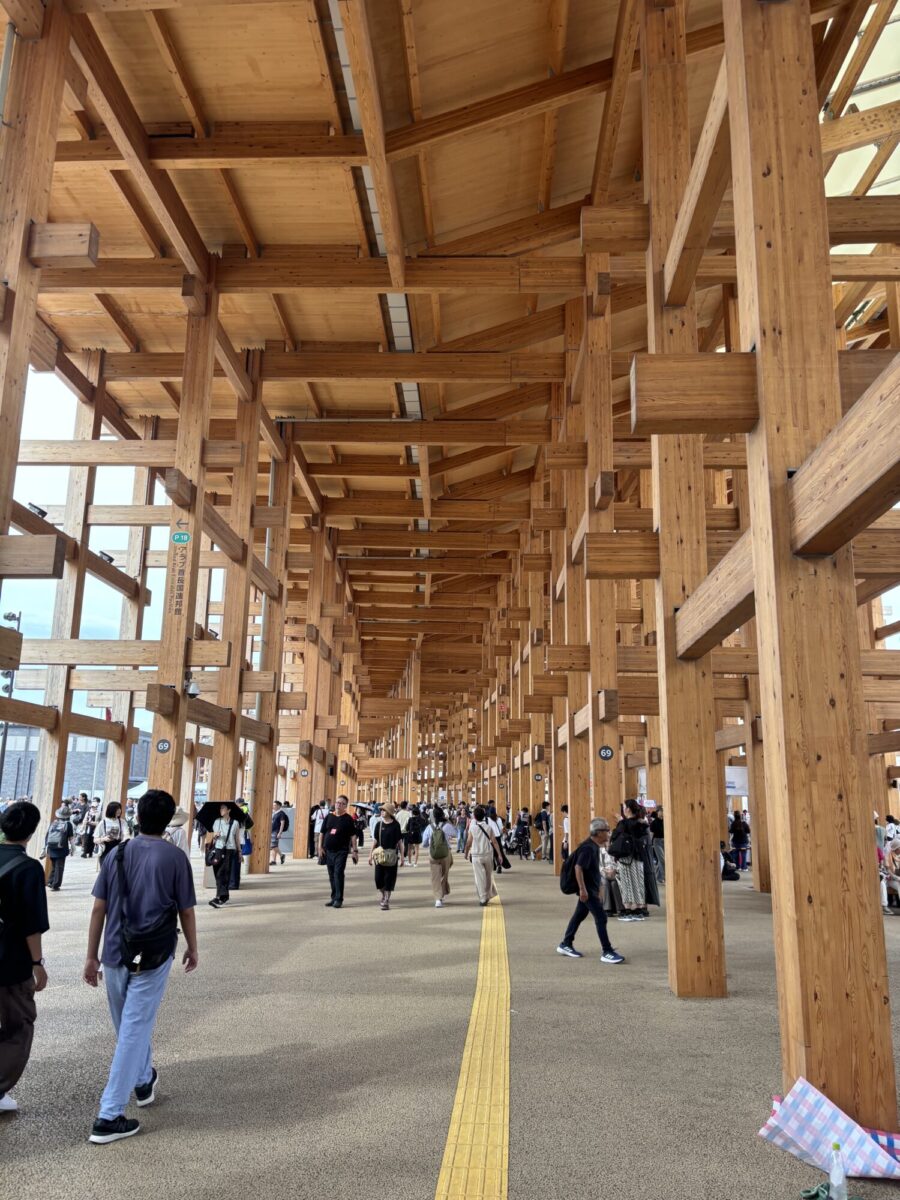 35度を超える暑さの中でも、大屋根リングの下は風が通り抜けてとても涼しく、多くの人が自然と集まってくる空間になっていて、木がもつ温かさと心地よさを改めて実感しました。