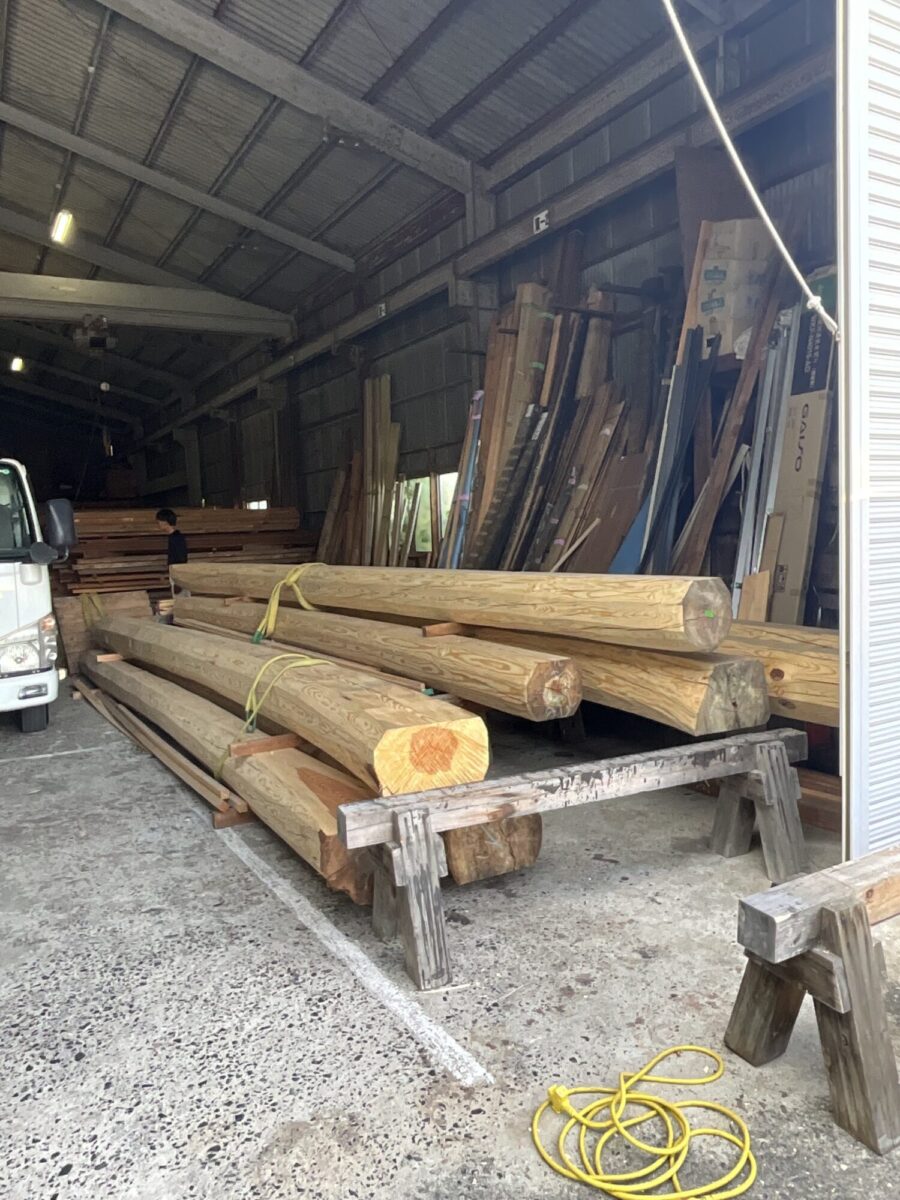 当社の木材倉庫で大工さんが手作業で木材の加工をしています。