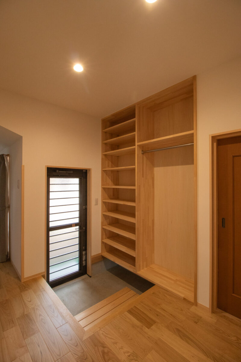 また、外仕事が多いご主人のために勝手口収納を設置。