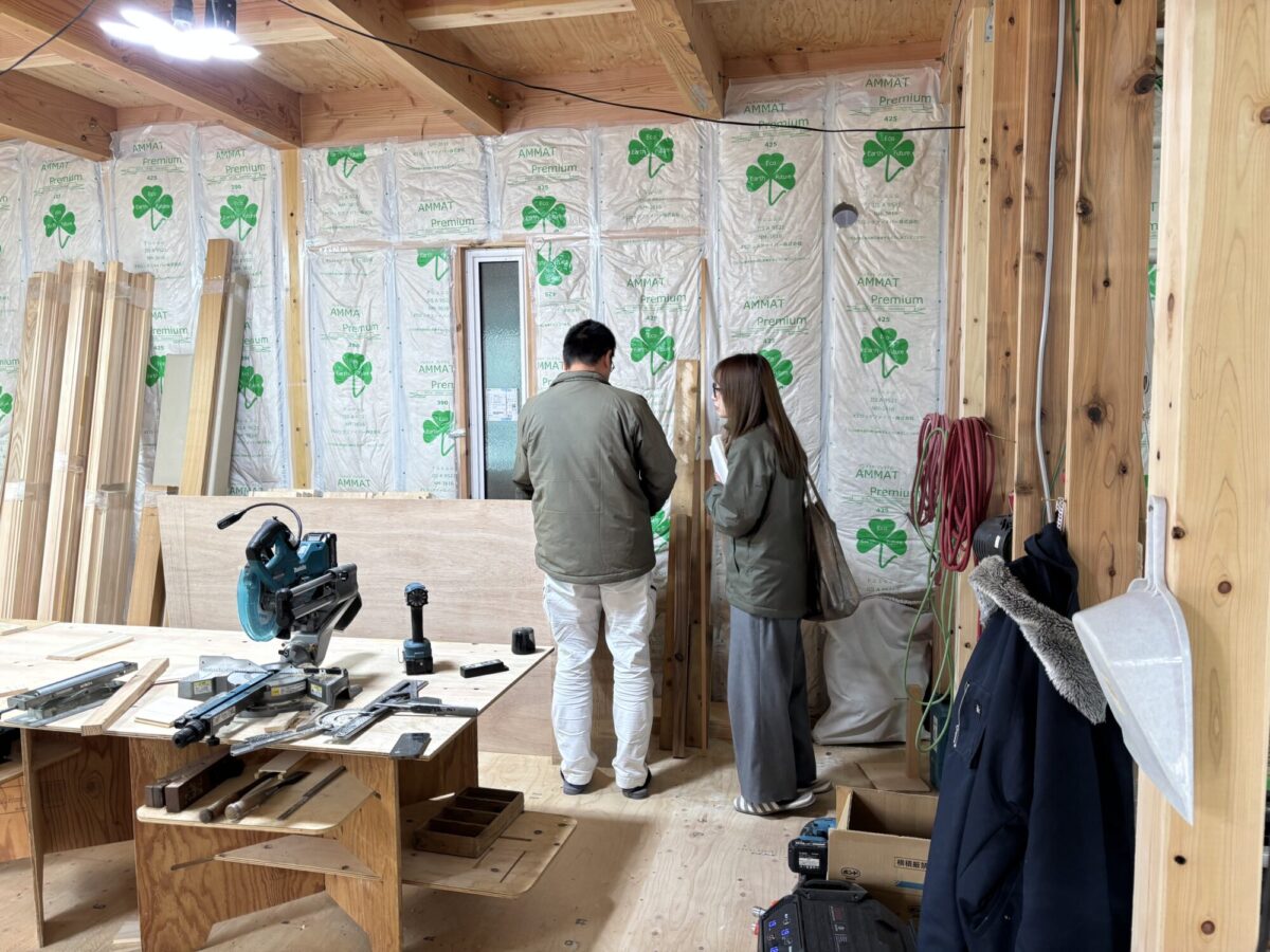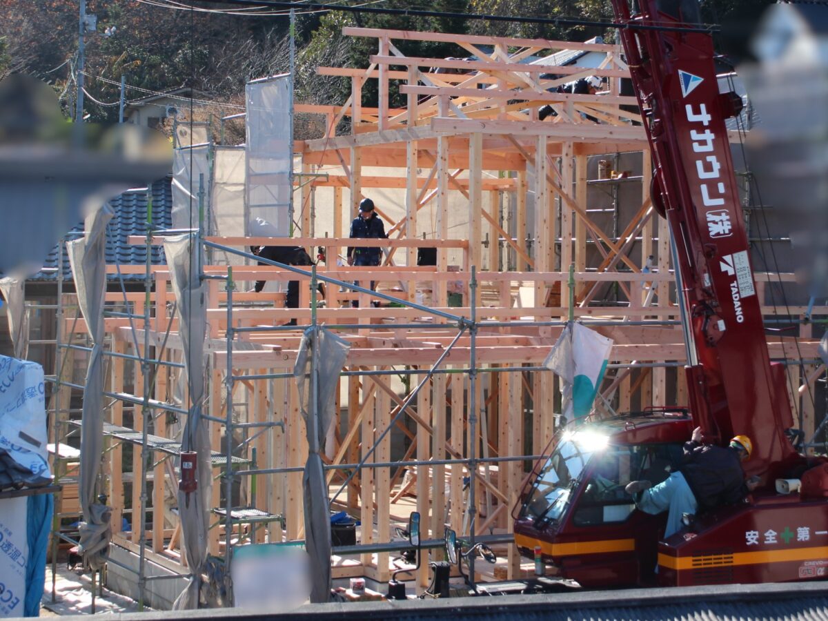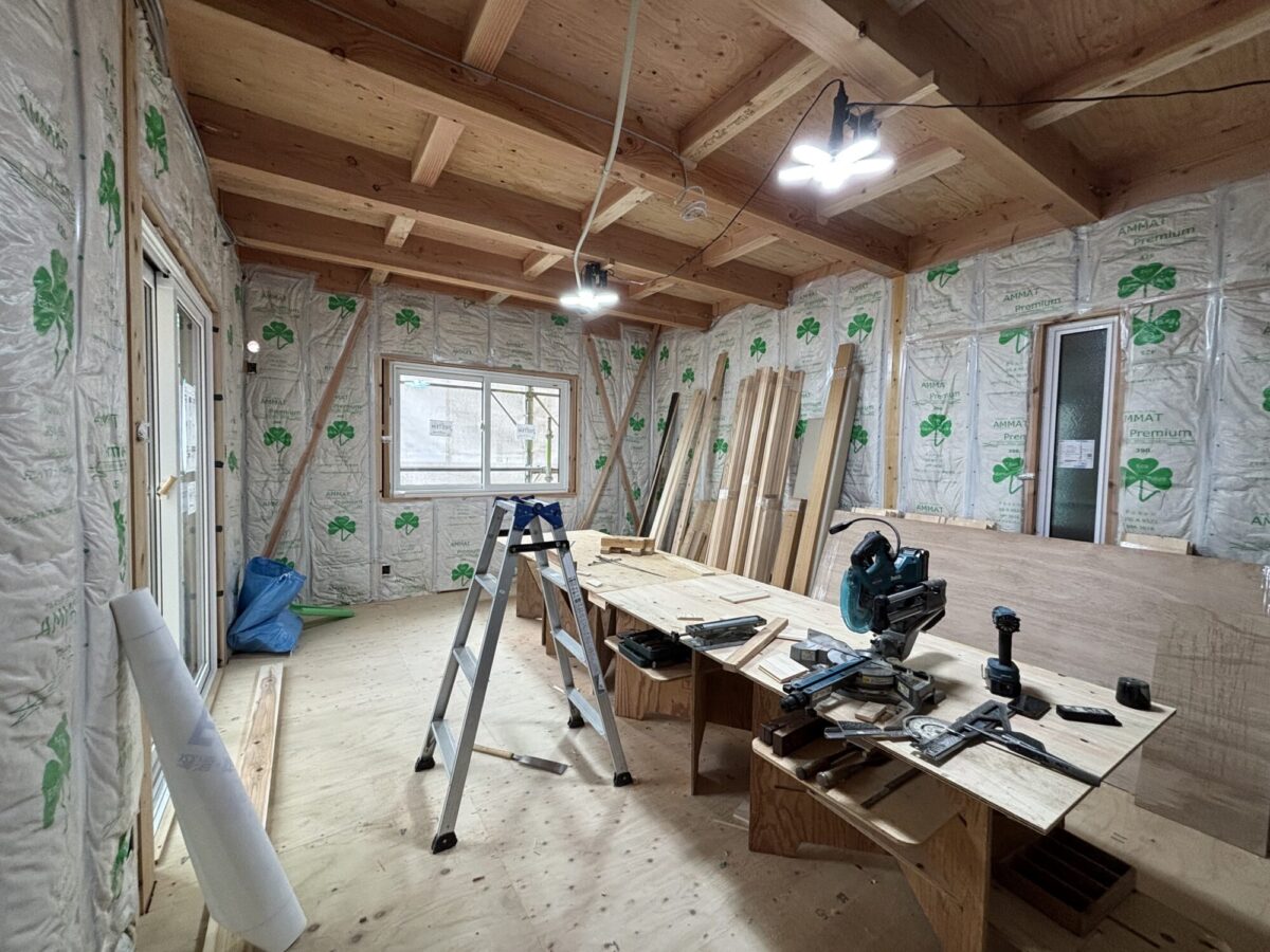 上棟の時から工事が進み、屋根と壁ができて、少しずつ家の全体像が分かるようになってきました。