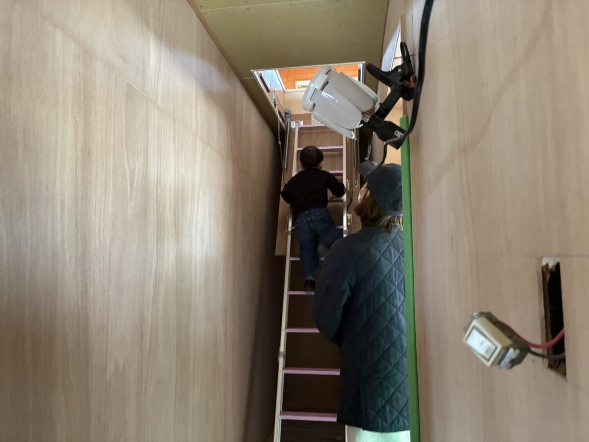 新しく取り替えた屋根裏への梯子を上がったり、
