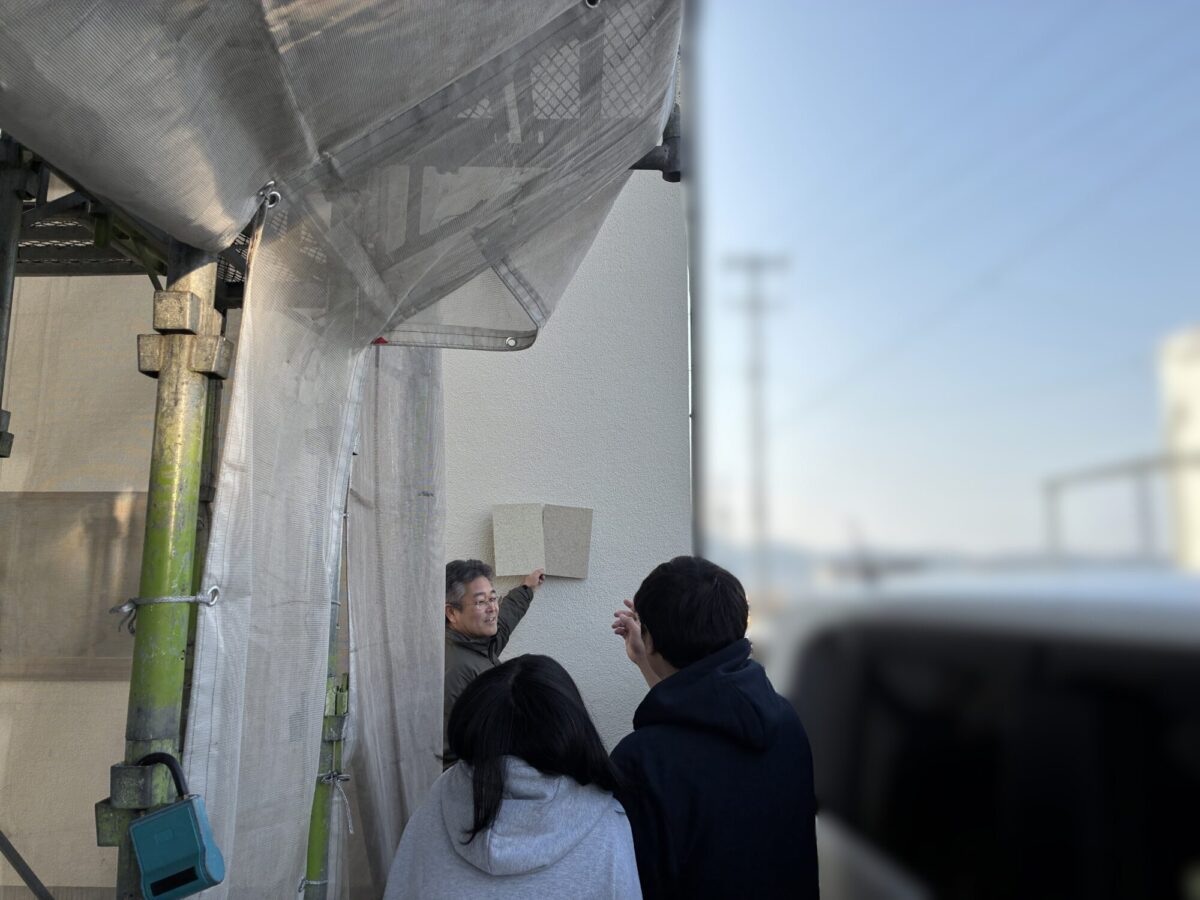 外壁のサンプルを日当たりの違う場所へ当てて