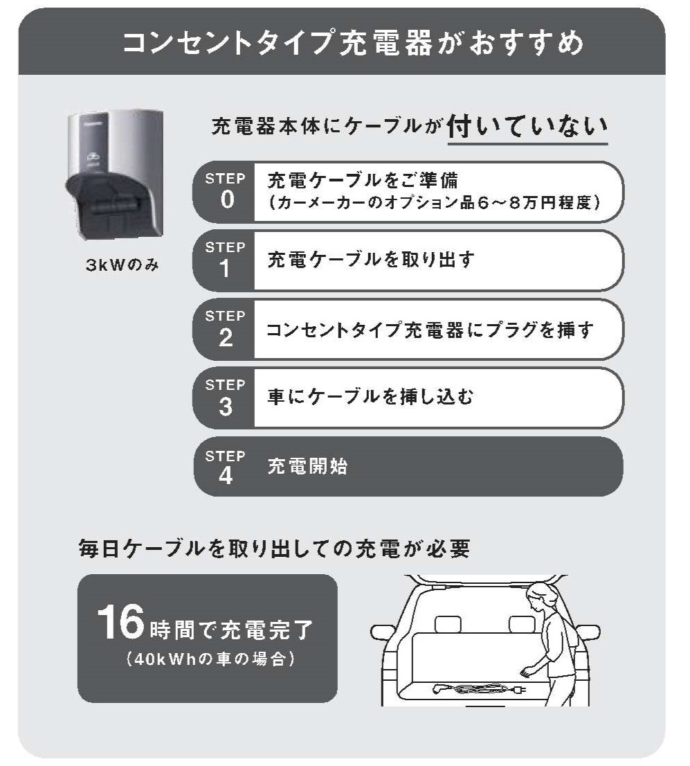 EV車購入時に専用ケーブルを準備し、充電のたびにケーブルを取り出して接続する手間はありますが、初期費用を抑えたい方や、将来の使い方を様子見したい方に向いているタイプです。