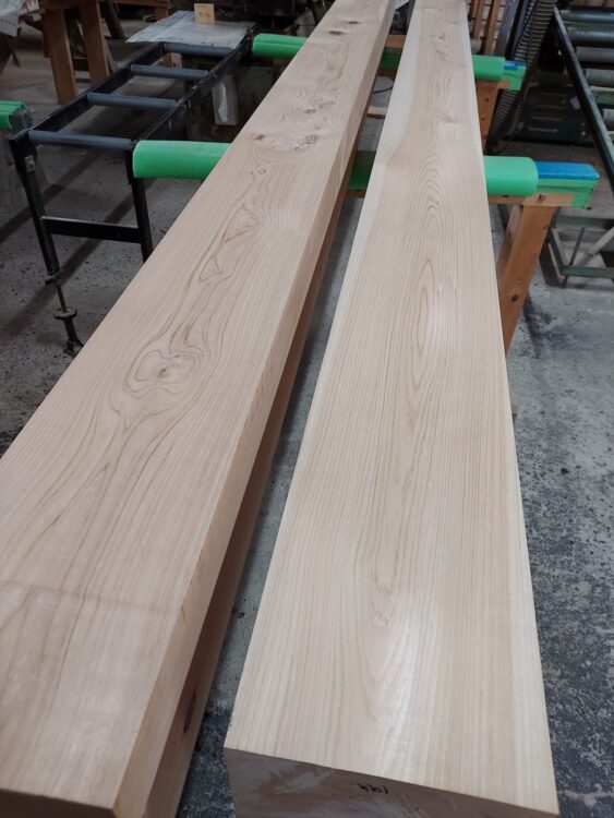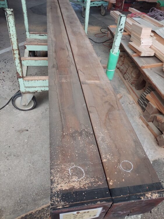 写真①は、リフォーム現場の補強化粧梁に使用する、桧の7寸角(210㎜角)です。