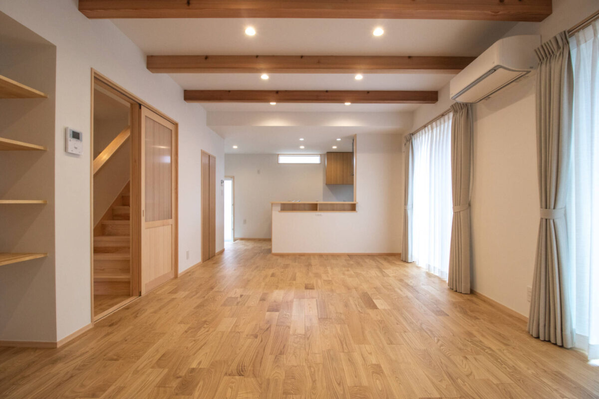 リビングは、無垢フローリングと梁あらわし天井で、